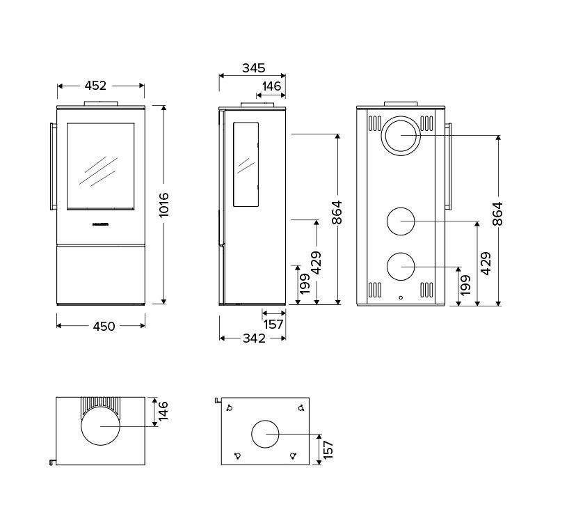 Paloilma voidaan ottaa huoneesta tai tuoda putkella ulkoa. Puhdaspalotekniikka (paloilma puhaltuu kuumana yläkautta liekkiin). Kiertoilmatoiminto (puhaltaa kuumaa ilmaa ja lämmittää suurenkin tilan nopeammin). Savuhormiliitäntä päältä tai takaa.