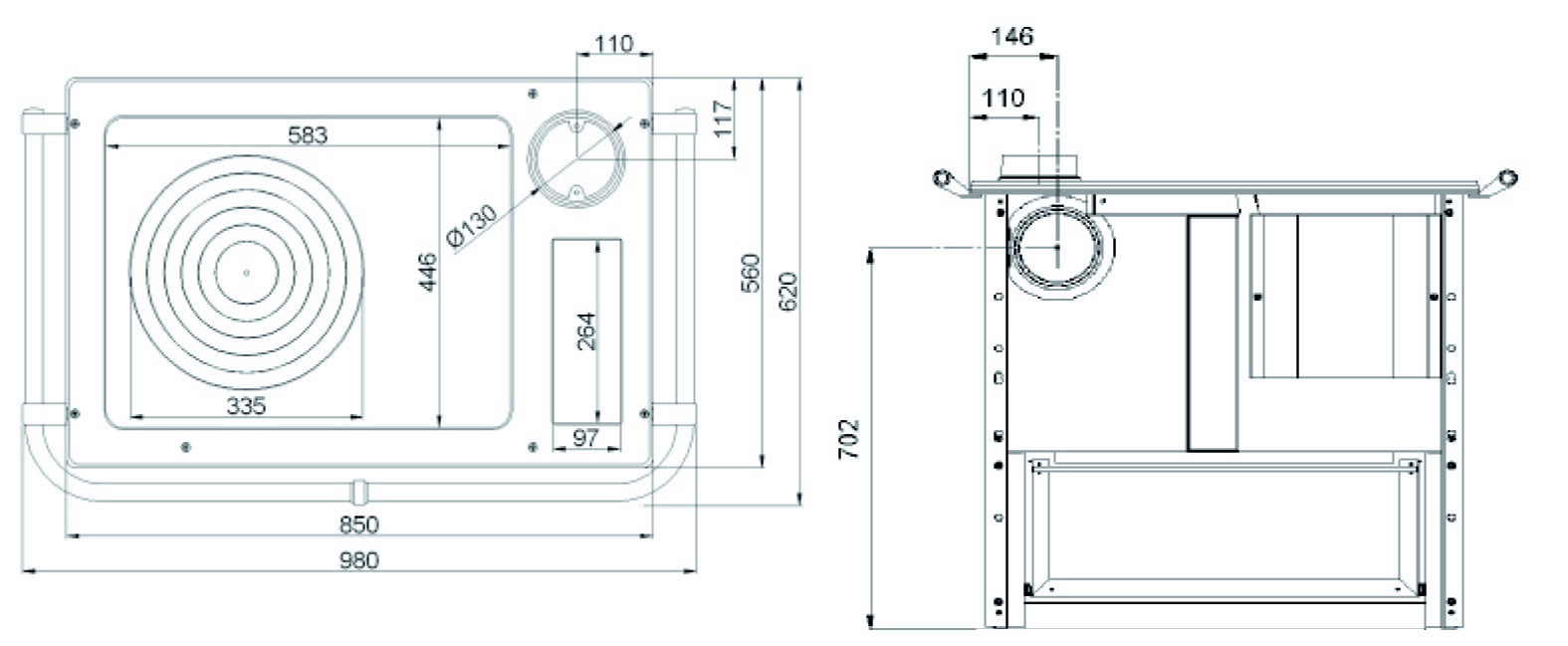 Kestävä teräksinen keittolevy, emalipinnoite, uuni lämpötilanäytöllä ja lasiluukulla, tulipesä lasiluukulla, lämmityslokero uunin alla, sisältää ympäriinsä ulottuvan liesitangon. Lisävarusteena vesisäiliö.